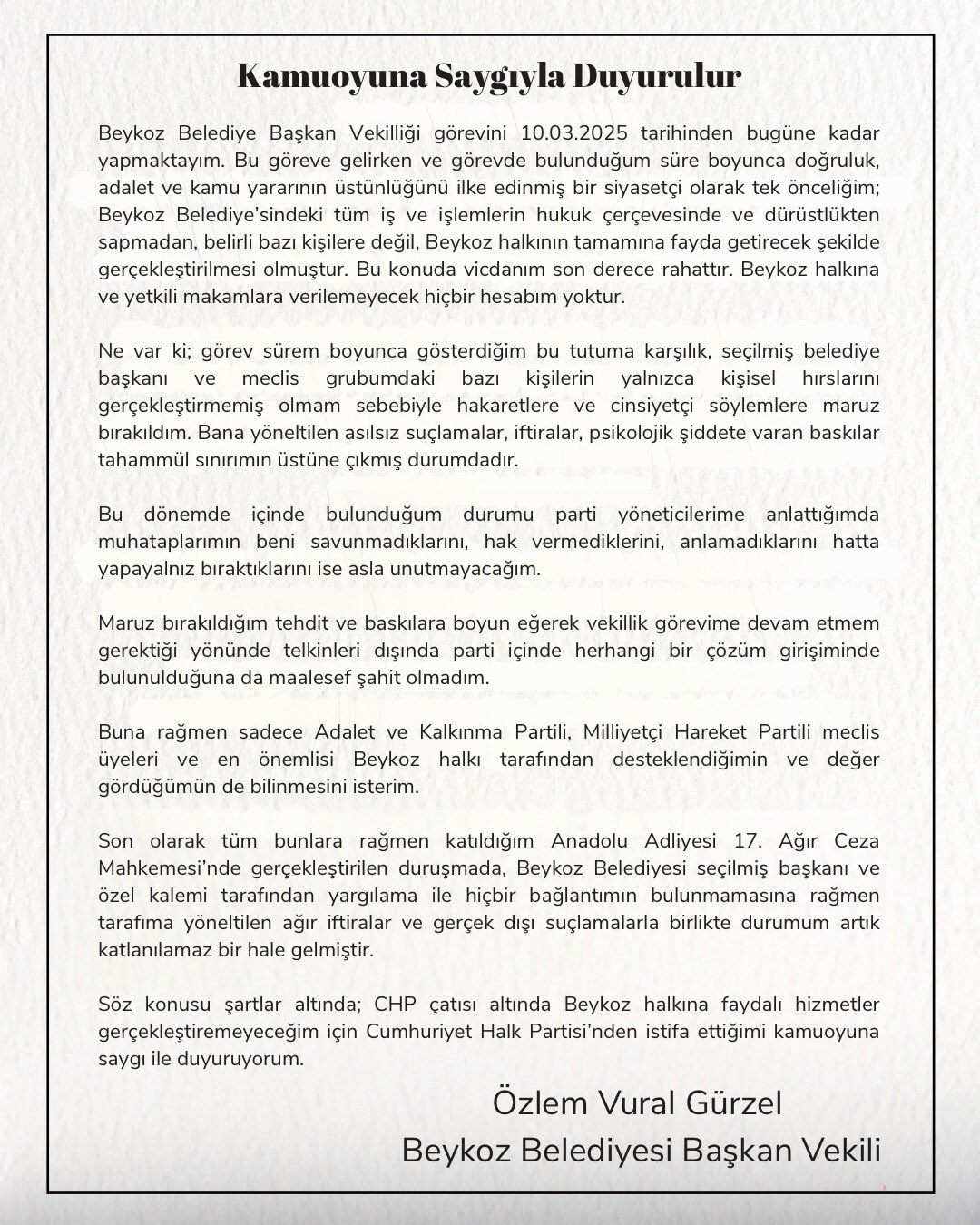 Beykoz Belediye Başkanvekili Özlem Vural Gürzel, Cumhuriyet Halk Partisi’nden (CHP) ayrıldığını duyurdu. Gürzel, sosyal medya hesabı üzerinden yaptığı açıklamada kararının gerekçelerini ayrıntılı şekilde paylaştı.