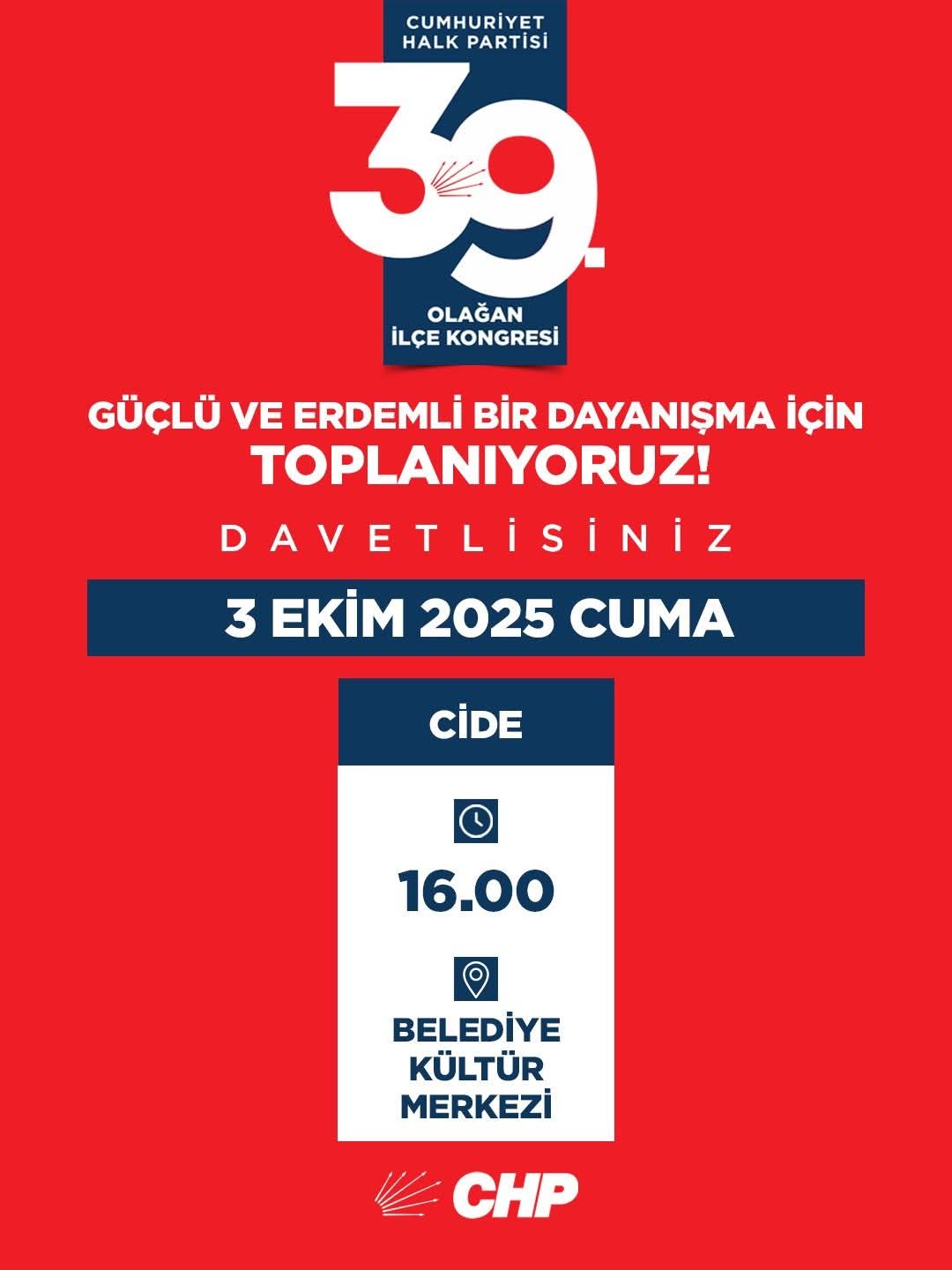 CHP Cide İlçe Örgütü, 39. Olağan İlçe Kongresi’ni 3 Ekim 2025 Cuma günü saat 16.00’da Cide Belediye Kültür Merkezi’nde gerçekleştirecek.