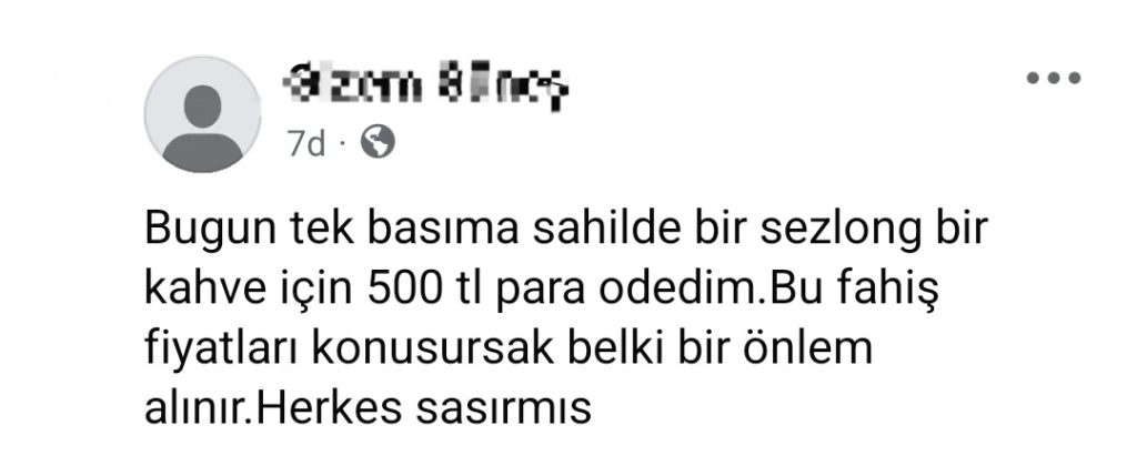 “Cide’de bugün tek başıma sahilde bir şezlong ve bir kahve için 500 TL para ödedim. Bu fahiş fiyatları konuşursak belki bir önlem alınır. Herkes şaşırmış durumda.”