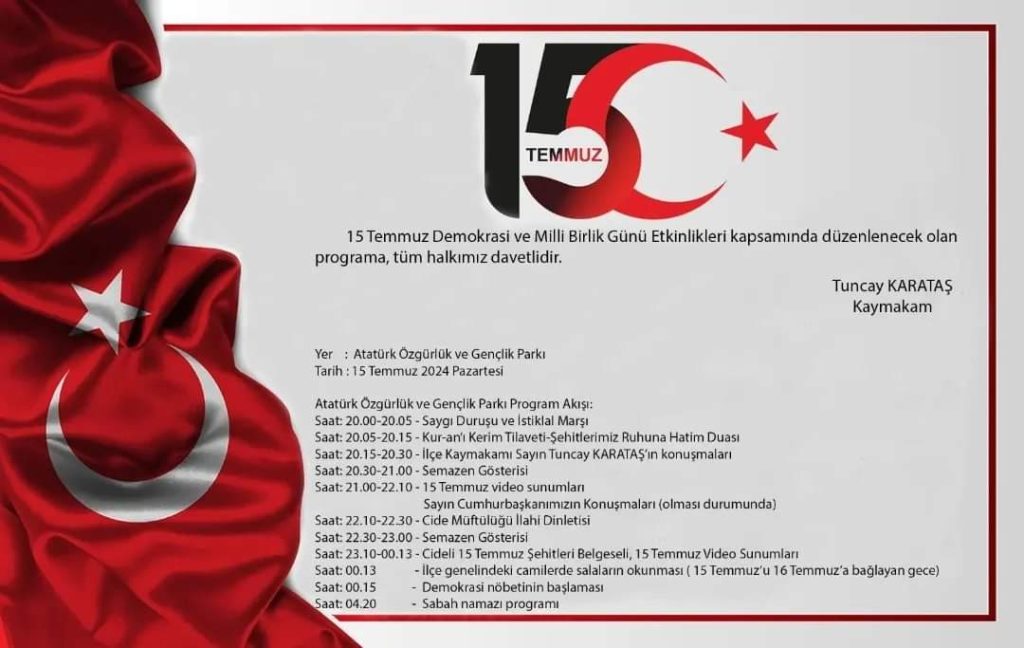 15 Temmuz Demokrasi ve Milli Birlik Günü etkinlikleri kapsamında düzenlenen programa tüm halkımız davetlidir. Etkinlik, 15 Temmuz 2024 Pazartesi günü Atatürk Özgürlük ve Gençlik Parkı’nda gerçekleşecektir. Programın akışı şu şekildedir: