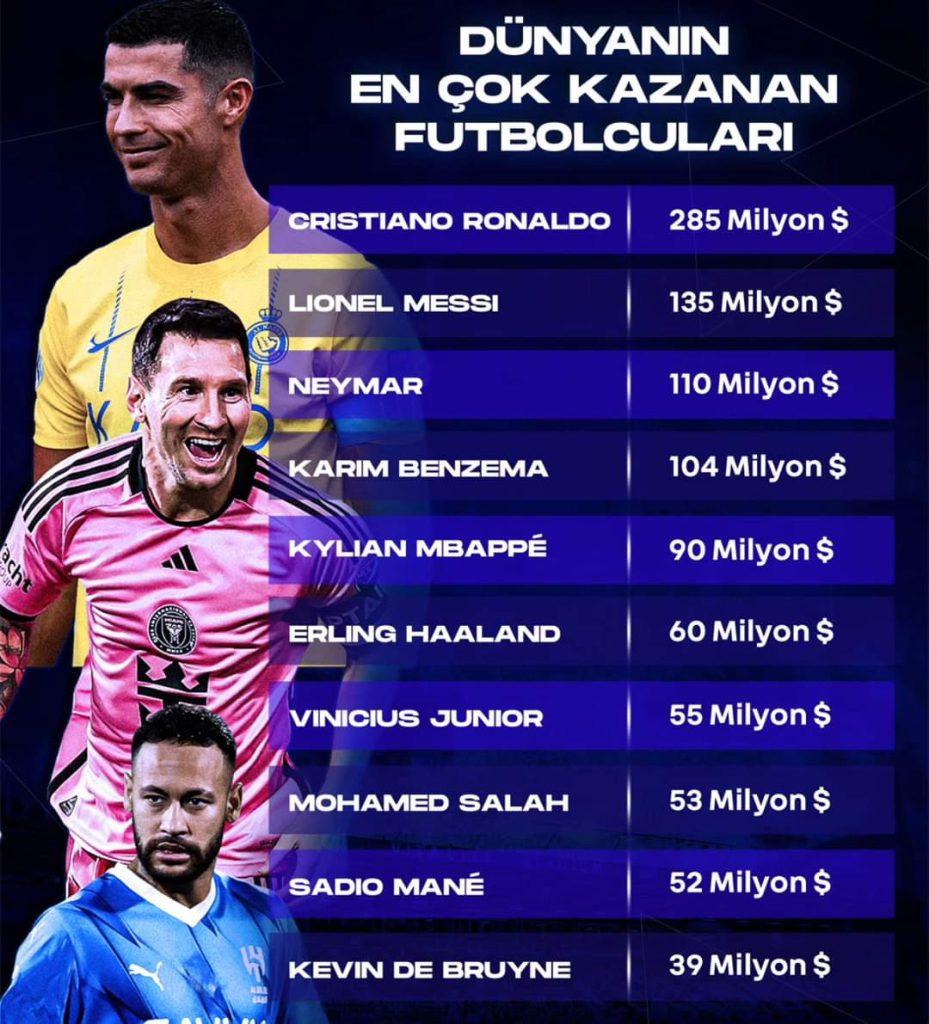 2024 yılında dünyanın en çok kazanan futbolcuları listesi dikkat çekici. Listenin zirvesinde, yıllık kazancı 285 milyon dolar olan Cristiano Ronaldo yer alıyor. Ronaldo’yu, 135 milyon dolarla Lionel Messi ve 110 milyon dolarla Neymar takip ediyor.