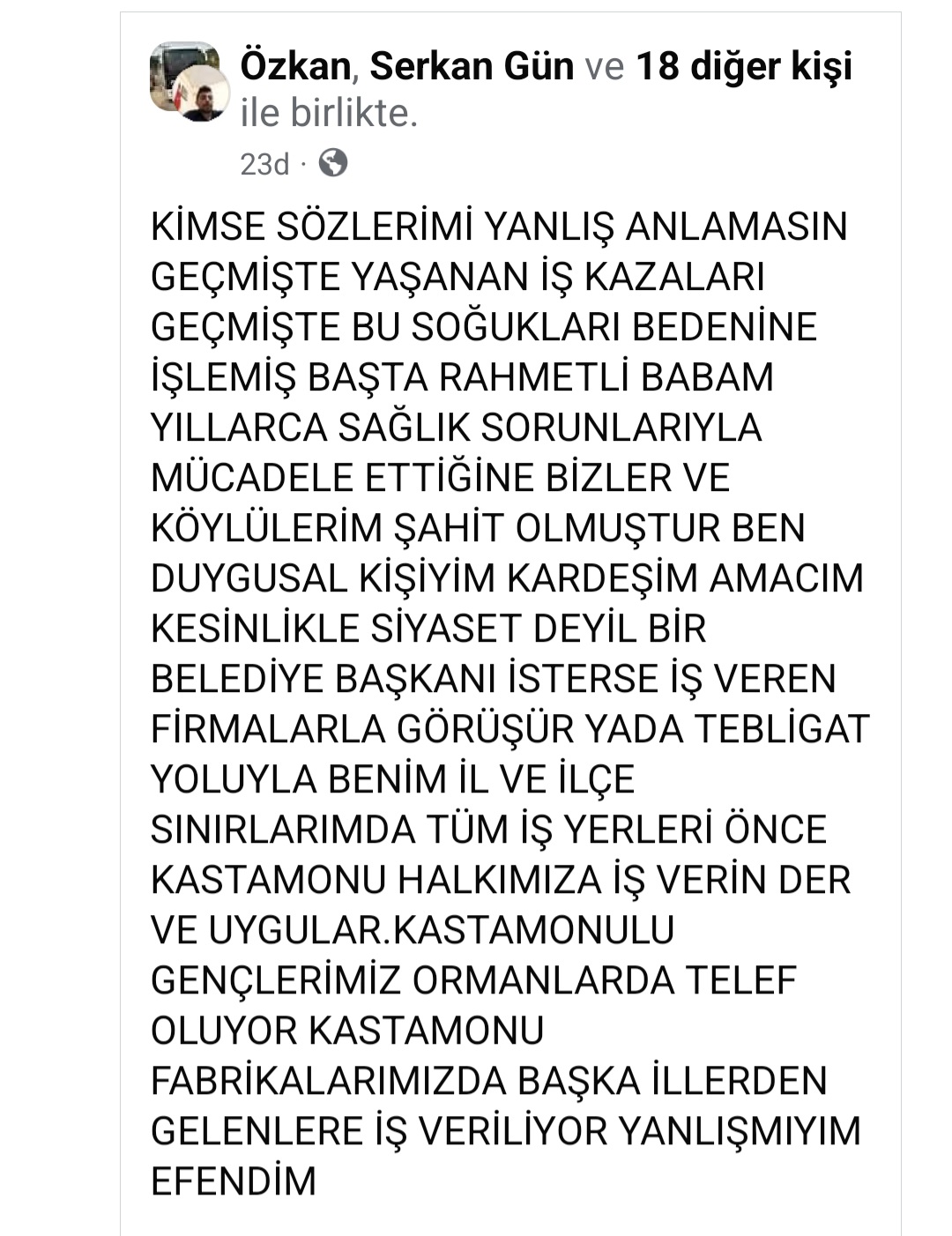 Paylaşımda, bölgede iş kazaları ve zorlu çalışma koşulları nedeniyle geçmişte sağlık sorunları yaşayan kişilerden ve kendi ailesinden bahseden vatandaş, işçilerin öncelikli olarak Kastamonu halkından seçilmesi gerektiğini vurguluyor.