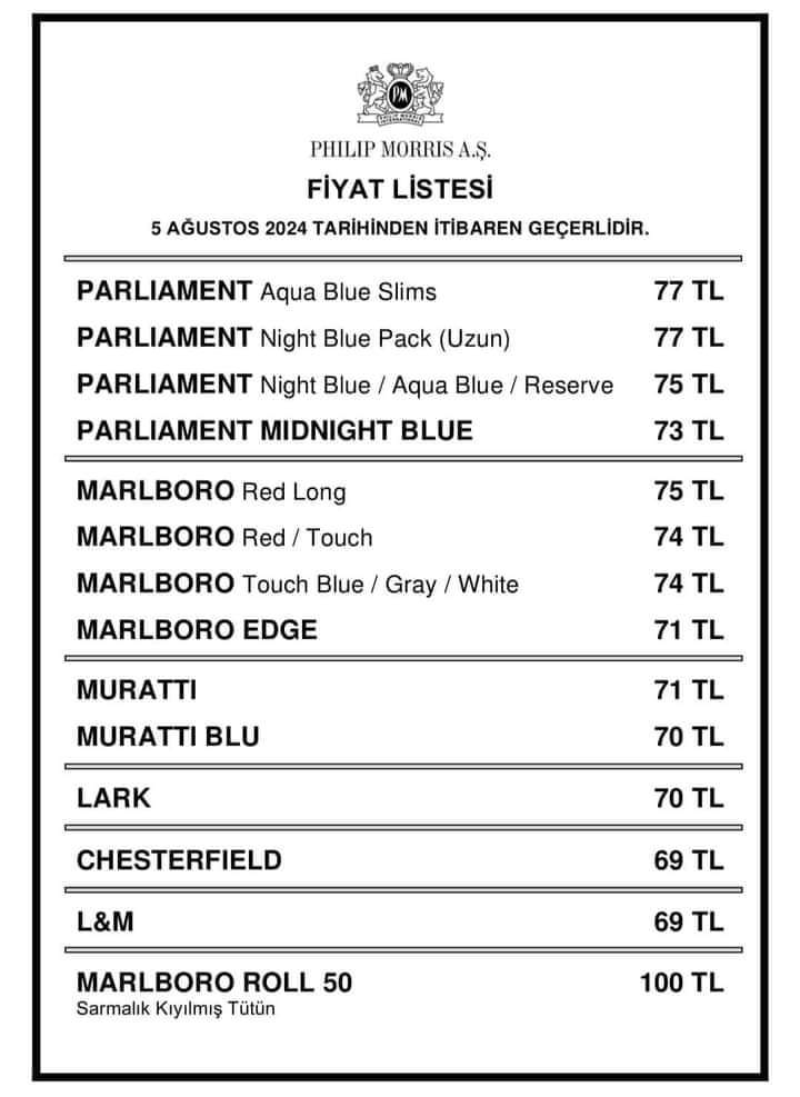 5 Ağustos 2024 tarihinden itibaren geçerli olmak üzere, bir sigara grubunun tüm ürünlerine 4 TL zam yapıldı. Yapılan son zamla birlikte sigara fiyatları güncellendi ve en ucuz sigara 69 TL, en pahalı sigara ise 77 TL oldu.